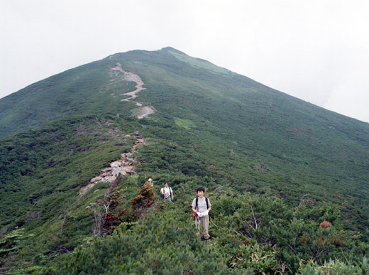 | 前を登る妻の足取りは軽く昨日の疲れは全く残っていないようだ、岩塊の乗り越えも軽やかで上手になってきたこれなら行けそうだ此処から頂上まで約2時間の予定。 | |