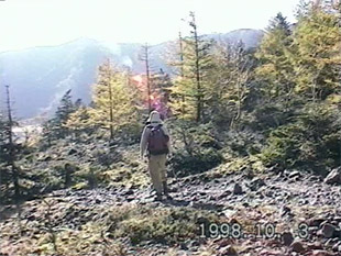 | 35mスチルカメラとVIDEOカメラを交互に撮って居たのでうっかりメガネを登山路の道端に置き忘れ、気が付いて今登って来た道を戻って避難小屋付近を探し回ったら何と無残にもつぶれていたのを思い出した。 |