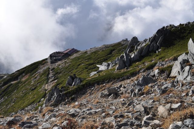| 写真を撮りながらの登りで既に午後2時40分、乗越浄土(2,860m)で荷を下ろし小休止、巨大な岩峰が宝剣岳(2,931m)、予定より時間が遅れたので登頂は明日に。 | ||