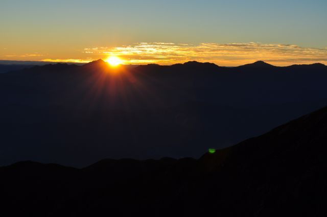 | 甲斐駒ヶ岳の横から眩いばかりの日の出だ。 |