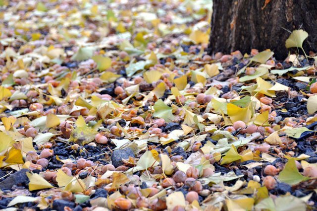 | 駐車場の傍らに数本の銀杏、ギンナンを拾い集めた、横を流れる丹波川の清流で実を洗い流す |